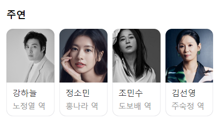 주숙정 (김선영): 정열의 엄마이며, 옛날 시어머니스러운 면모를 가진 인물.